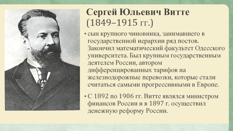 С 1892 по 1906 гг. Витте являлся министром финансов России и в 1897 г. осуществил денежную реформу России.
