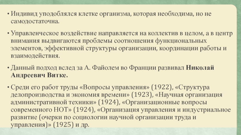 Н.Витке полагал, что с развитием производства, его концентрацией возрастает роль и значение управления им