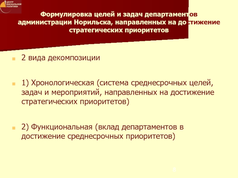 Слайд 8Формулировка целей и задач департаментов администрации Норильска, направленных на достижение стратегических