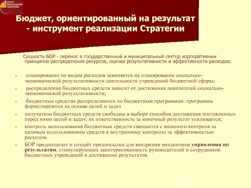 Сущность БОР - перенос в государственный и муниципальный сектор корпоративных принципов распределения ресурсов, оценки результативности и эффективности расходов: