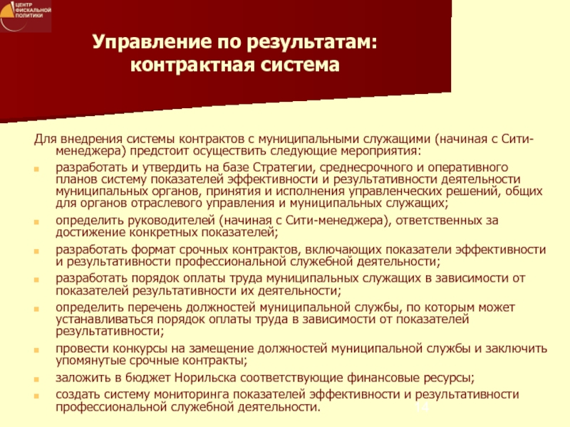 эффективная работа муниципальных служащих (включая Сити-менеджера) стимулируется с помощью системы трудовых контрактов (в перспективе)