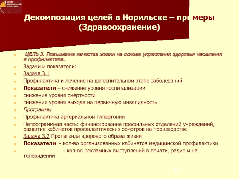 Слайд 10Декомпозиция целей в Норильске – примеры (Здравоохранение)