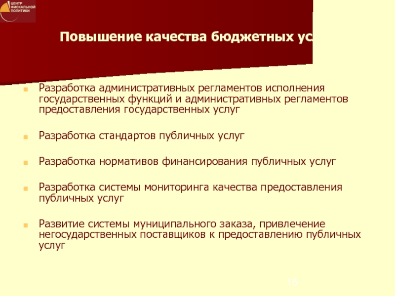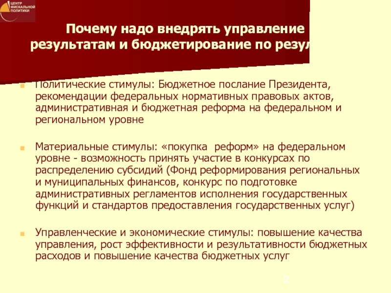 стимулы: Бюджетное послание Президента, рекомендации федеральных нормативных правовых актов, административная и бюджетная реформа на федеральном и региональном уровне