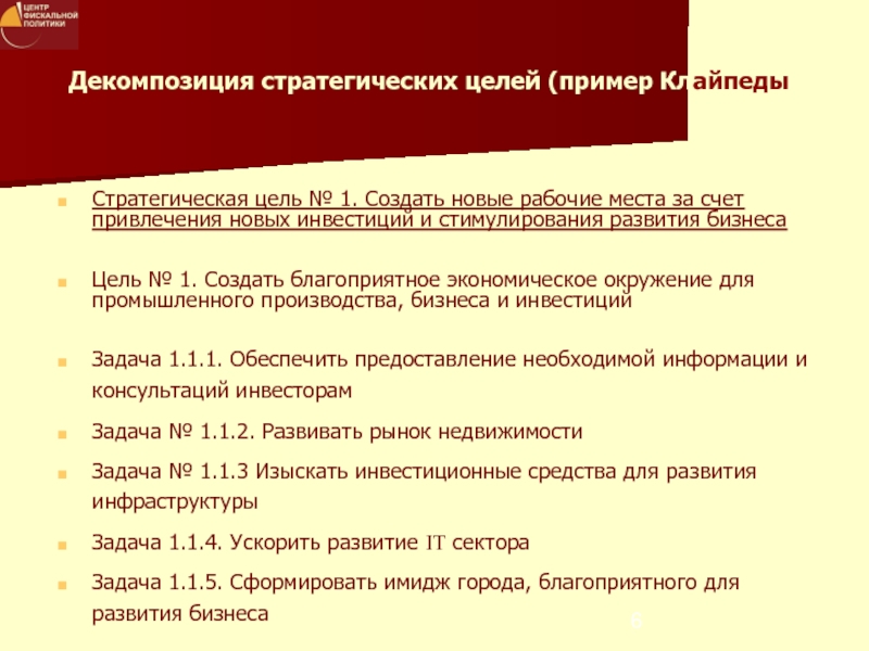 Слайд 6Декомпозиция стратегических целей (пример Клайпеды)