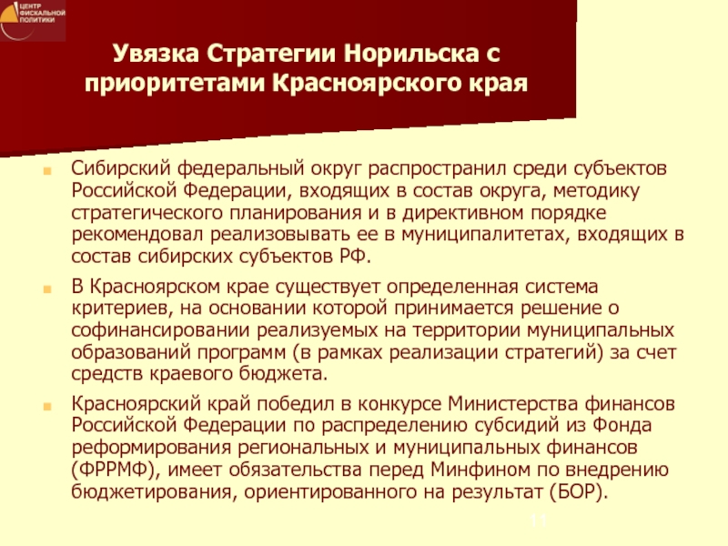 Слайд 11Увязка Стратегии Норильска с приоритетами Красноярского края