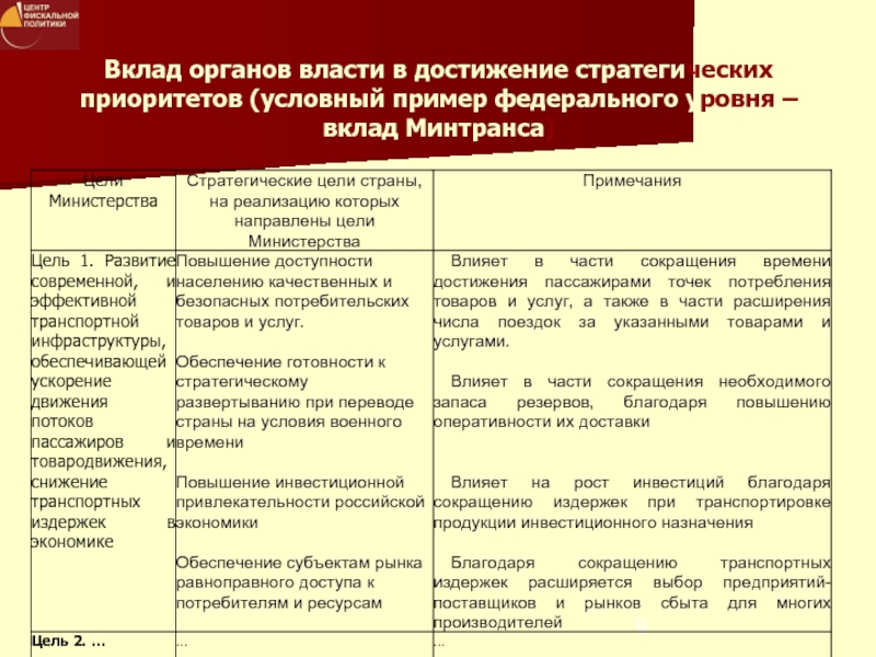 Слайд 9Вклад органов власти в достижение стратегических приоритетов (условный пример федерального уровня