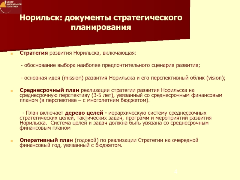 - План включает дерево целей - иерархическую систему среднесрочных стратегических целей, тактических задач, программ и мероприятий развития Норильска. Система целей и задач должна быть увязана со среднесрочным финансовым планом