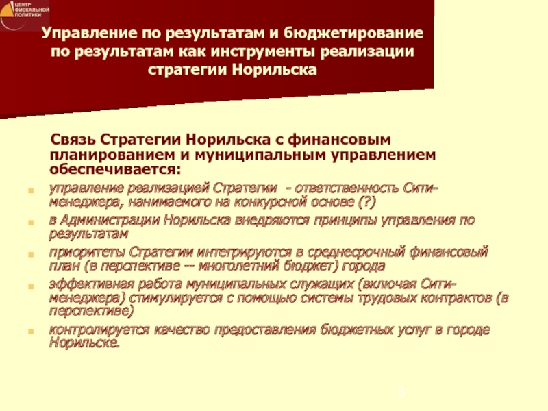 Связь Стратегии Норильска с финансовым планированием и муниципальным управлением обеспечивается:
