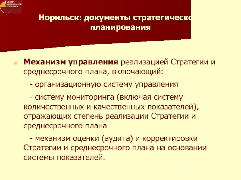 Среднесрочный план реализации стратегии развития Норильска на среднесрочную перспективу (3-5 лет), увязанный со среднесрочным финансовым планом (в перспективе – с многолетним бюджетом).