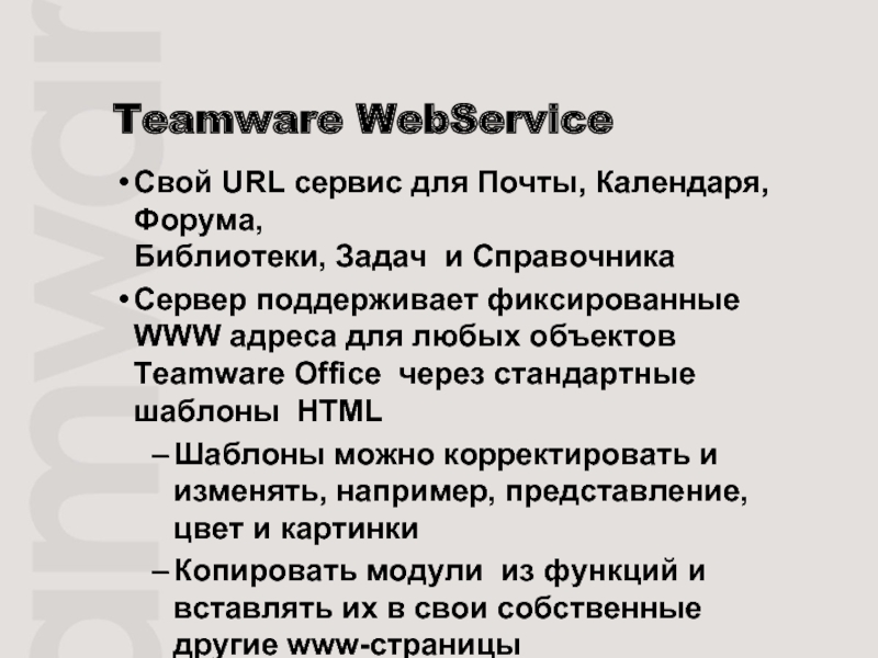 Сервер поддерживает фиксированные WWW адреса для любых объектов Teamware Office через стандартные шаблоны HTML