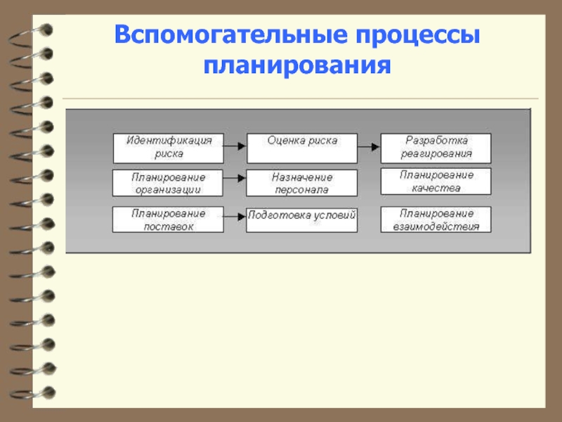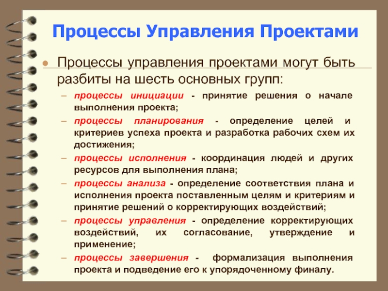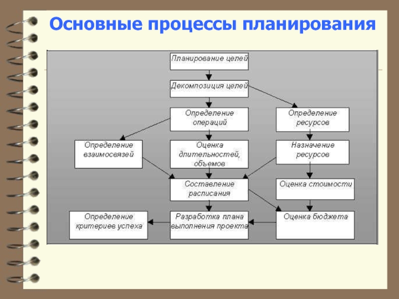процессы планирования - определение целей и критериев успеха проекта и разработка рабочих схем их достижения;