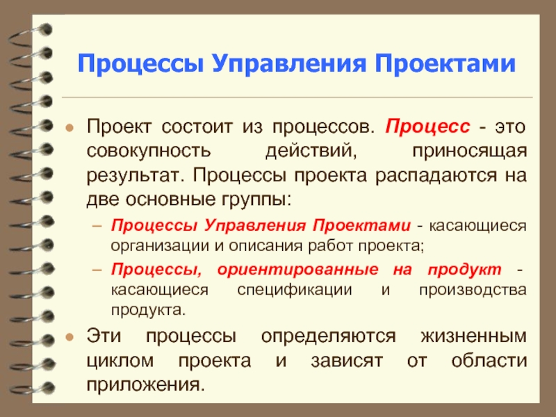 Процессы Управления Проектами - касающиеся организации и описания работ проекта;
