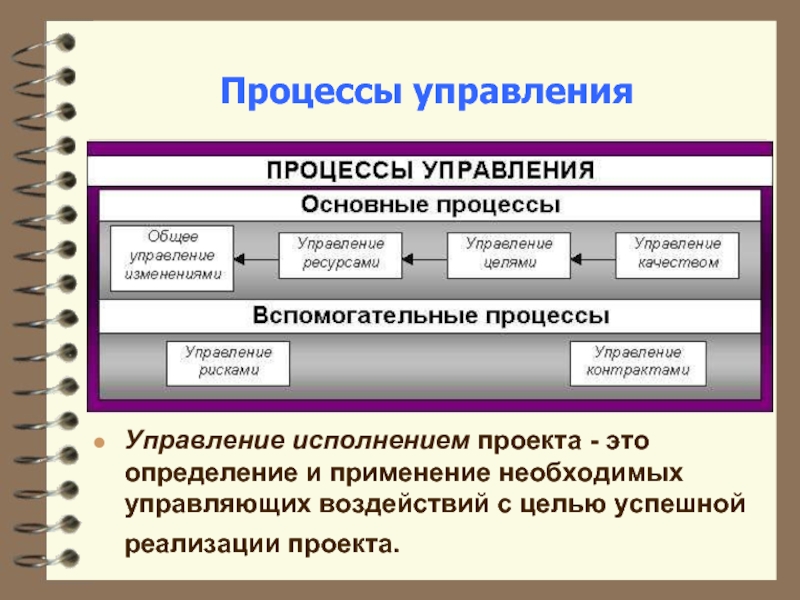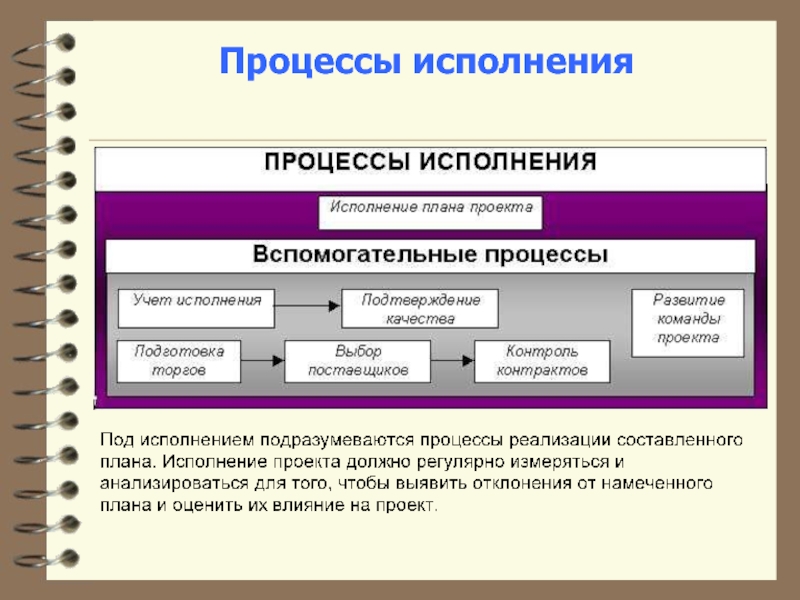 процессы исполнения - координация людей и других ресурсов для выполнения плана;