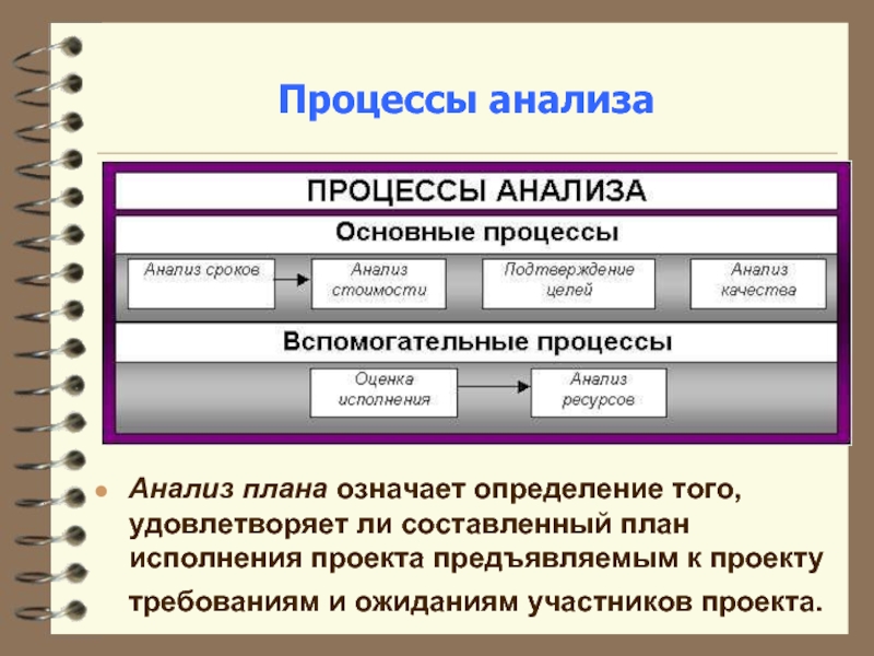 процессы анализа - определение соответствия плана и исполнения проекта поставленным целям и критериям и принятие решений о корректирующих воздействий;