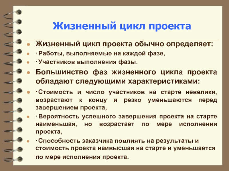Большинство фаз жизненного цикла проекта обладают следующими характеристиками: