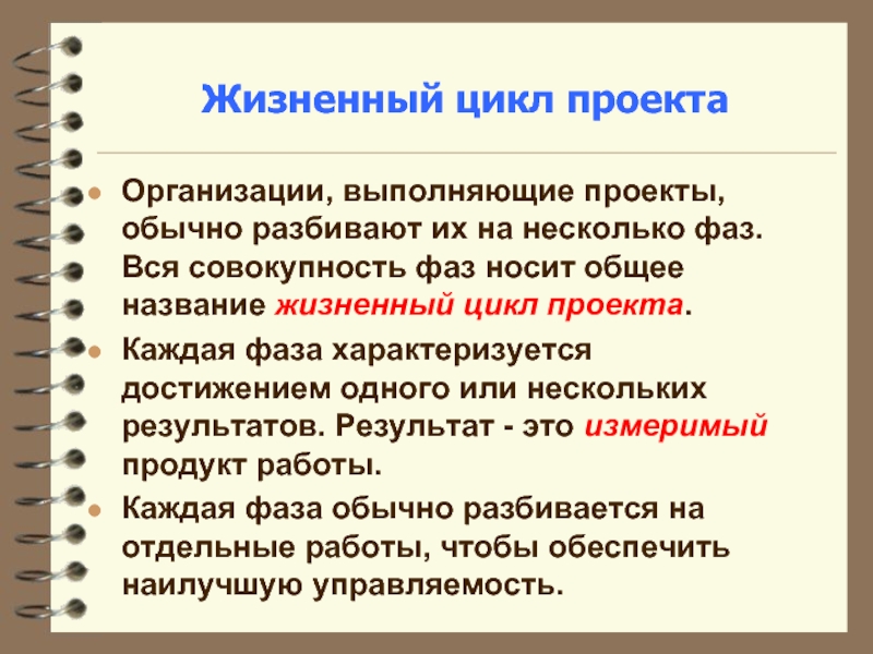 Каждая фаза характеризуется достижением одного или нескольких результатов. Результат - это измеримый продукт работы.