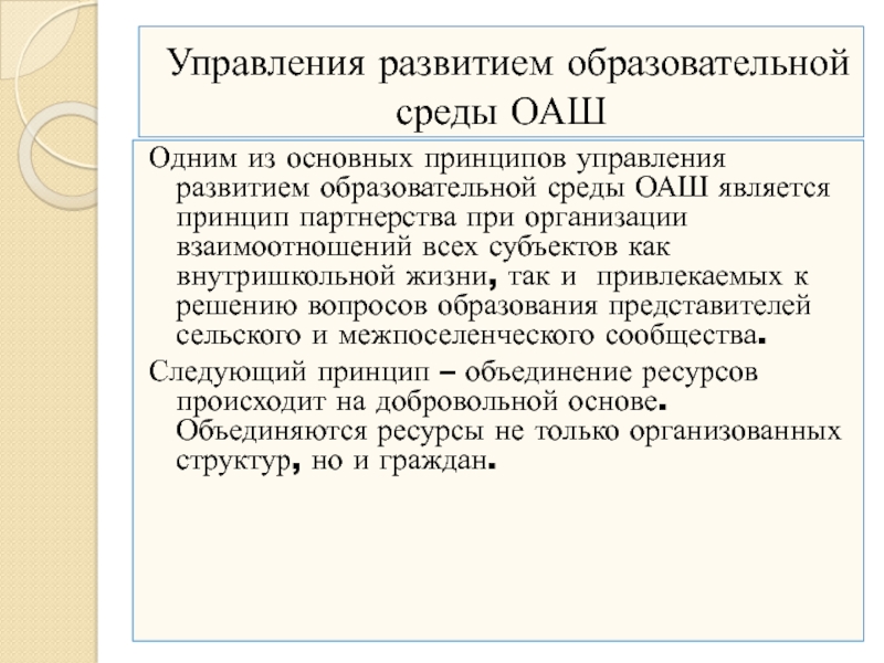 образовательной среды ОАШ является принцип партнерства при организации взаимоотношений всех субъектов как внутришкольной жизни, так и привлекаемых к решению вопросов образования представителей сельского и межпоселенческого сообщества.