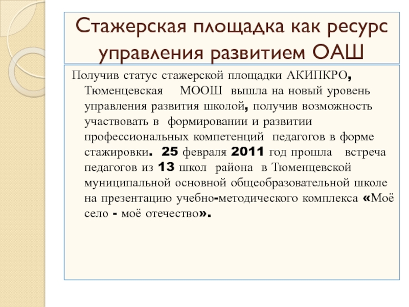 Слайд 14Стажерская площадка как ресурс управления развитием ОАШ