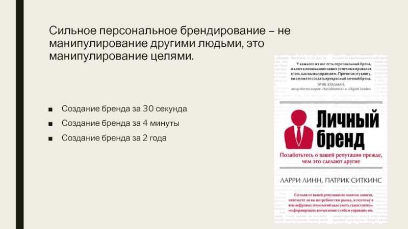 Слайд 20Сильное персональное брендирование – не манипулирование другими людьми, это манипулирование целями.