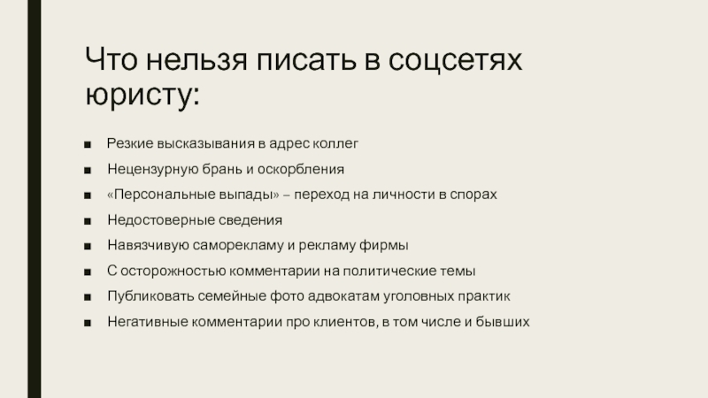 Слайд 23Что нельзя писать в соцсетях юристу: