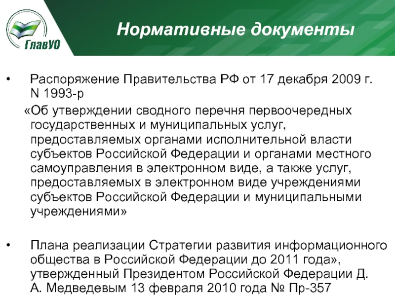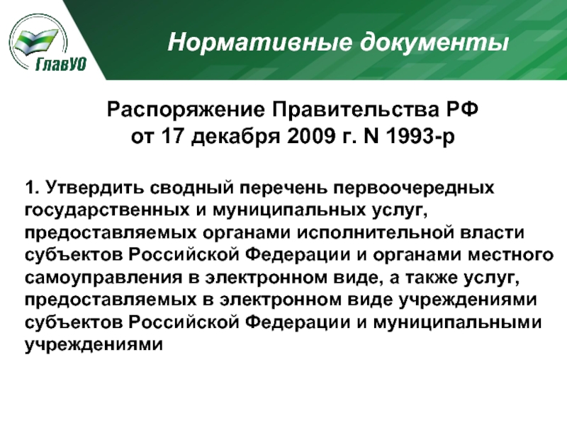 Слайд 9Распоряжение Правительства РФ от 17 декабря 2009 г. N 1993-р