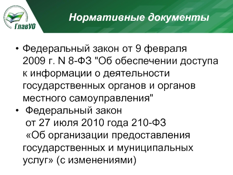 Слайд 7Федеральный закон от 9 февраля 2009 г. N 8-ФЗ "Об обеспечении доступа к