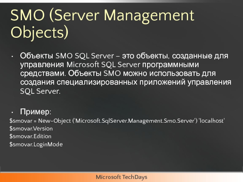 для управления Microsoft SQL Server программными средствами. Объекты SMO можно использовать для создания специализированных приложений управления SQL Server.
