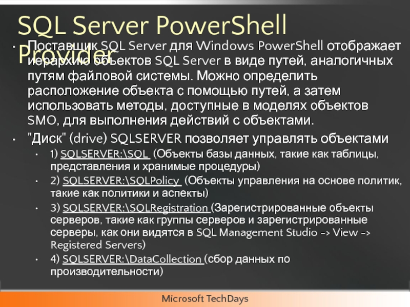 2) SQLSERVER:\SQLPolicy (Объекты управления на основе политик, такие как политики и аспекты)