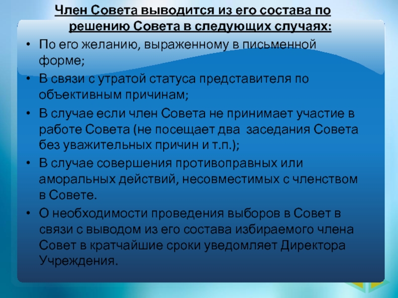В случае если член Совета не принимает участие в работе Совета (не посещает два заседания Совета без уважительных причин и т.п.);