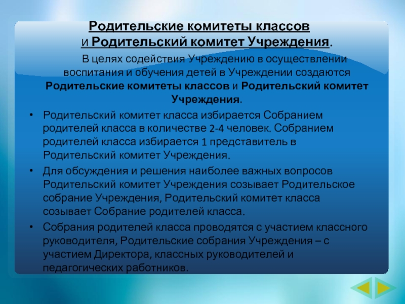 в осуществлении воспитания и обучения детей в Учреждении создаются Родительские комитеты классов и Родительский комитет Учреждения.
