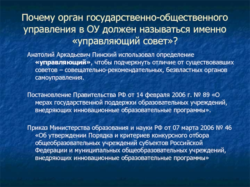 Слайд 4Почему орган государственно-общественного управления в ОУ должен называться именно «управляющий совет»?