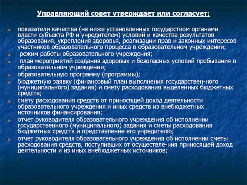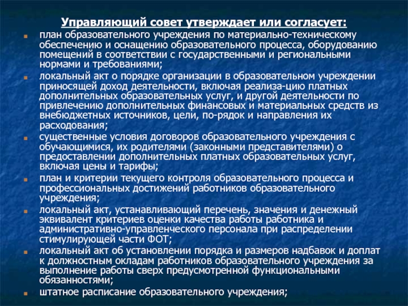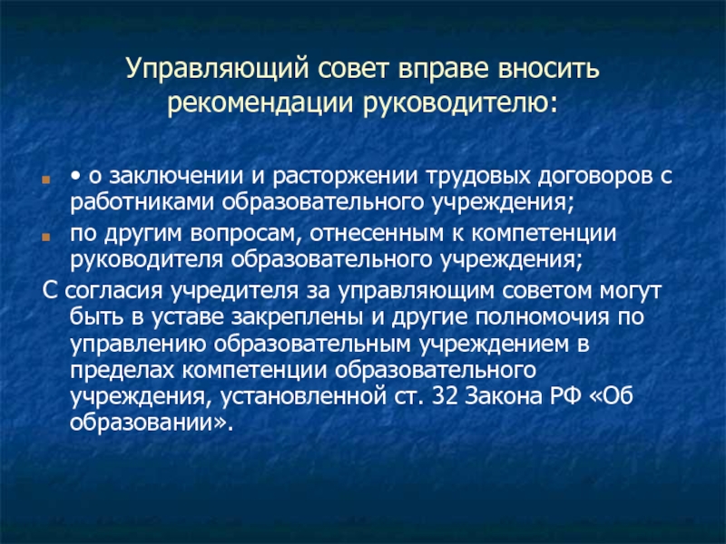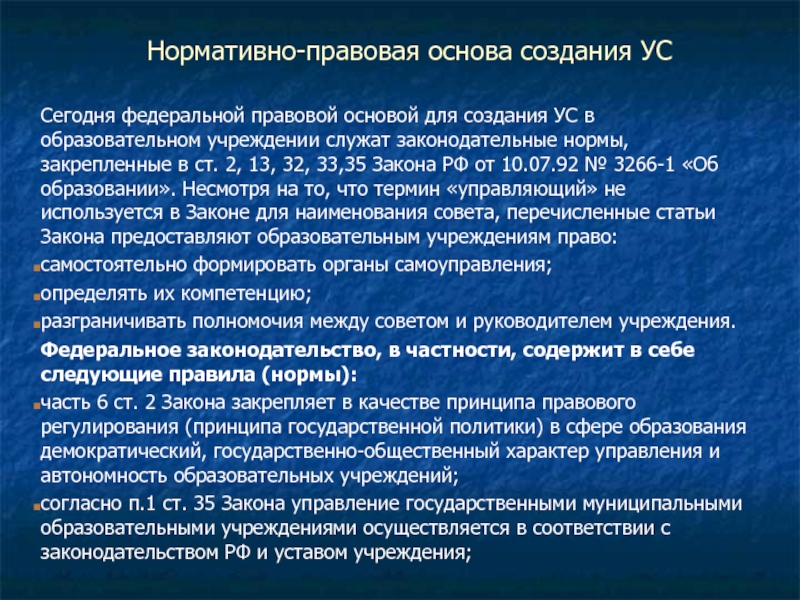 образовательном учреждении служат законодательные нормы, закрепленные в ст. 2, 13, 32, 33,35 Закона РФ от 10.07.92 № 3266-1 «Об образовании». Несмотря на то, что термин «управляющий» не используется в Законе для наименования совета, перечисленные статьи Закона предоставляют образовательным учреждениям право: