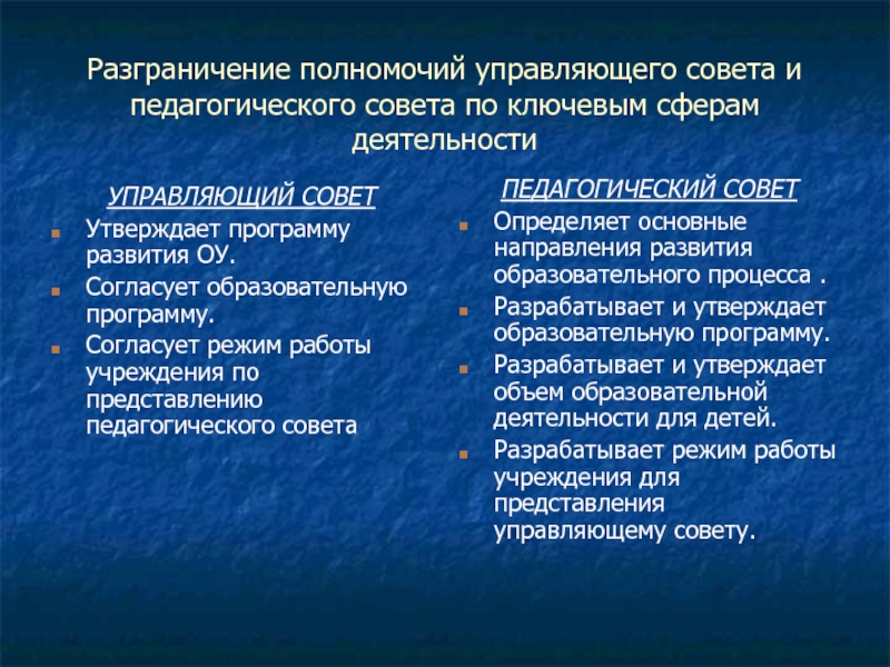 Слайд 10Разграничение полномочий управляющего совета и педагогического совета по ключевым сферам деятельности