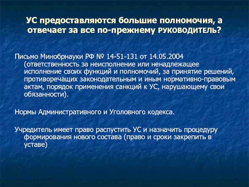 Минобрнауки РФ № 14-51-131 от 14.05.2004 (ответственность за неисполнение или ненадлежащее исполнение своих функций и полномочий, за принятие решений, противоречащих законодательным и иным нормативно-правовым актам, порядок применения санкций к УС, нарушающему свои обязанности).