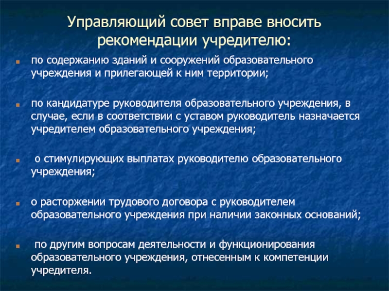 Слайд 20Управляющий совет вправе вносить рекомендации руководителю:
