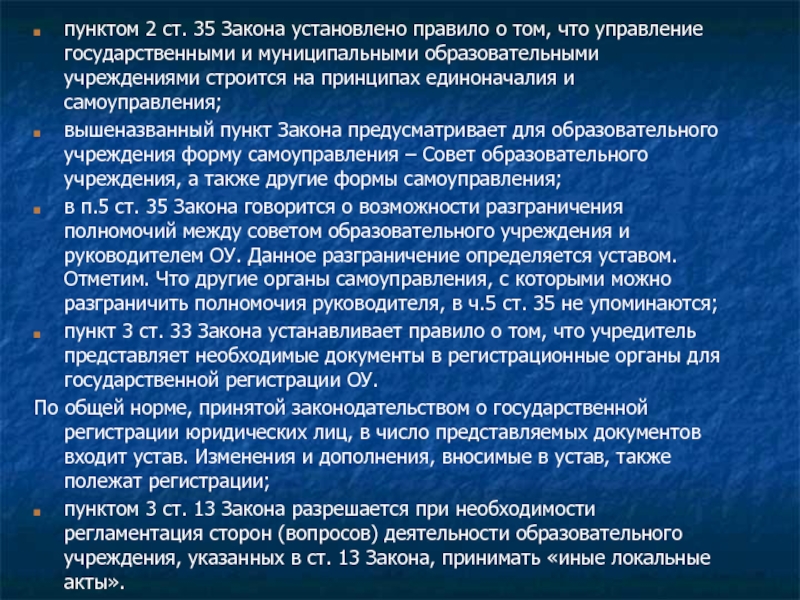 согласно п.1 ст. 35 Закона управление государственными муниципальными образовательными учреждениями осуществляется в соответствии с законодательством РФ и уставом учреждения;