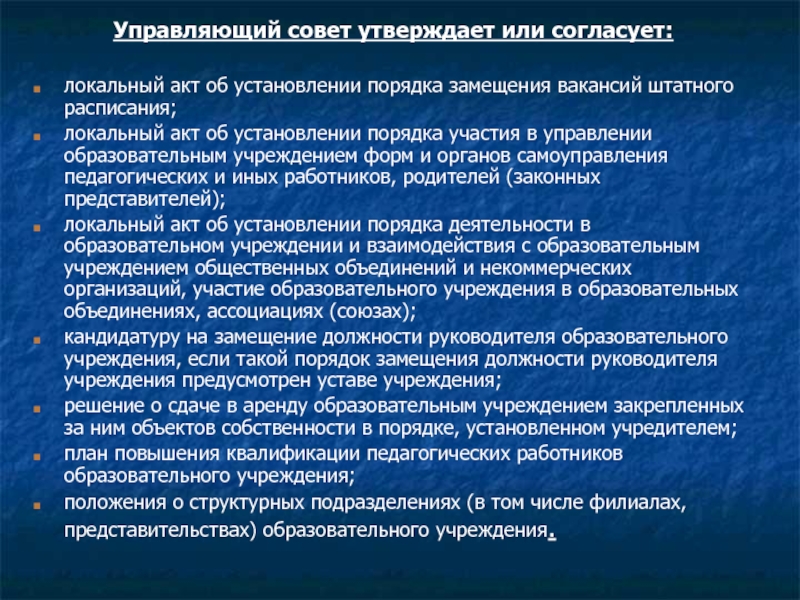 локальные правовые акты учреждения, регламентирующие деятельность управляющего совета.