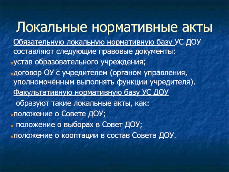 Обязательную локальную нормативную базу УС ДОУ составляют следующие правовые