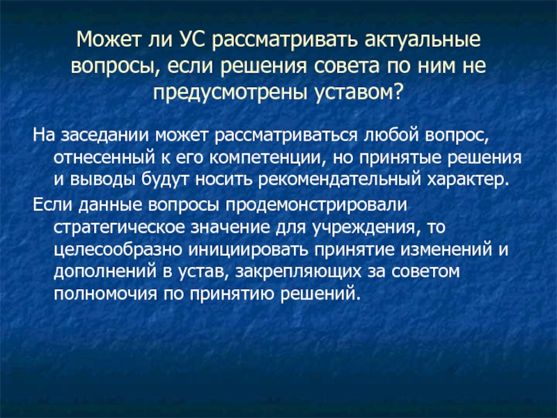 Слайд 21Может ли УС рассматривать актуальные вопросы, если решения совета по ним
