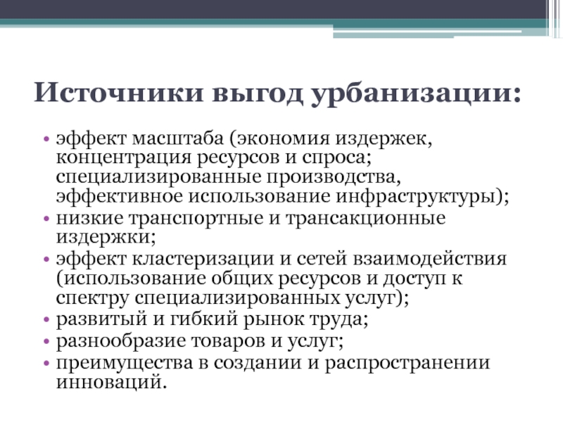 Слайд 15Источники выгод урбанизации: