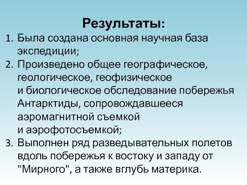 Выполнен ряд разведывательных полетов вдоль побережья к востоку и западу от "Мирного", а также вглубь материка.