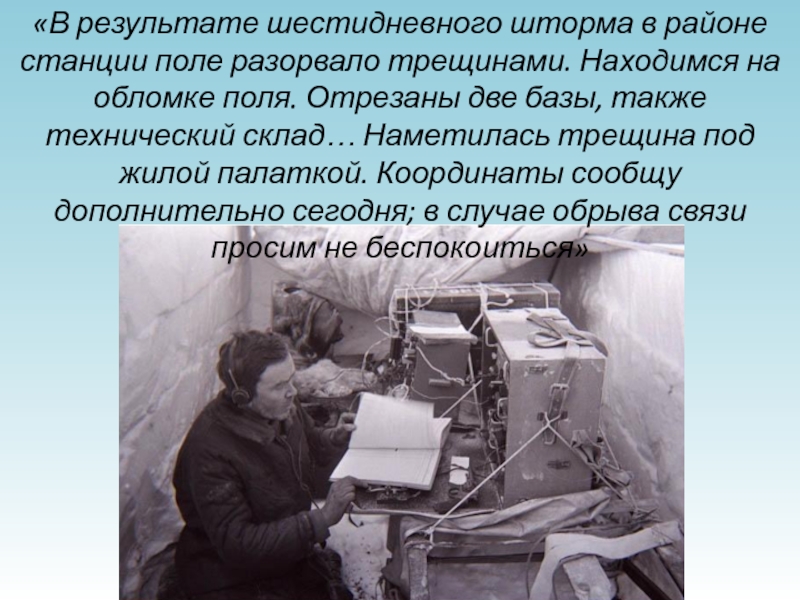 Слайд 3«В результате шестидневного шторма в районе станции поле разорвало трещинами. Находимся