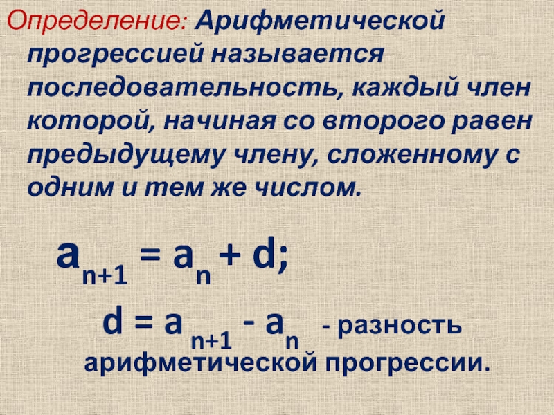 Слайд 6Определение: Арифметической прогрессией называется последовательность, каждый член которой, начиная со второго