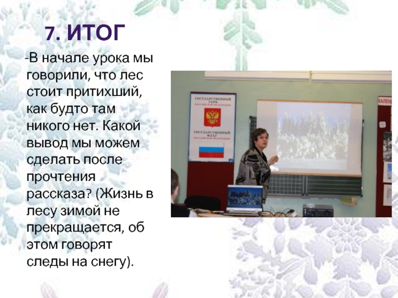 притихший, как будто там никого нет. Какой вывод мы можем сделать после прочтения рассказа? (Жизнь в лесу зимой не прекращается, об этом говорят следы на снегу).