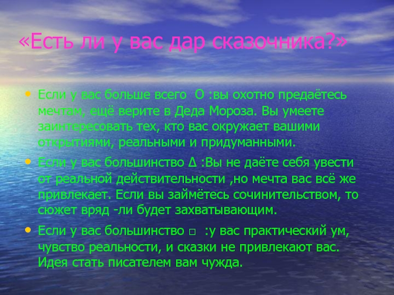 Если у вас большинство □ :у вас практический ум, чувство реальности, и сказки не привлекают вас. Идея стать писателем вам чужда.