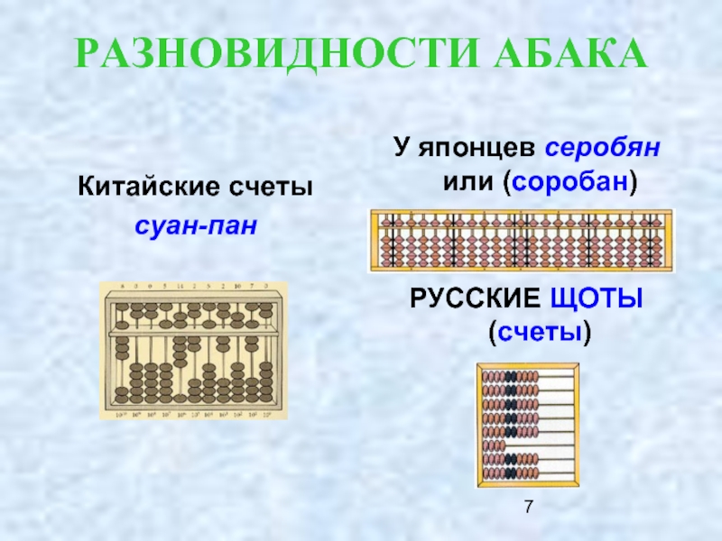 Слайд 7РАЗНОВИДНОСТИ АБАКА