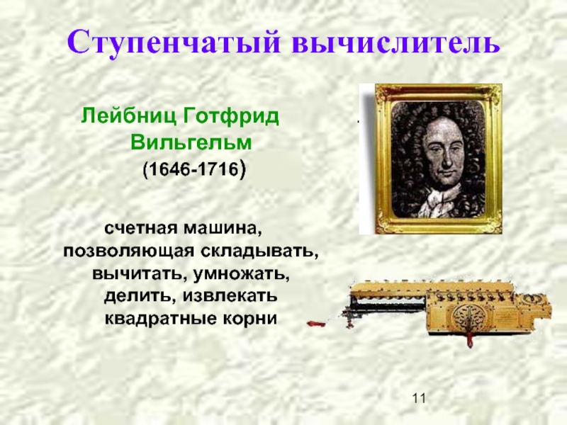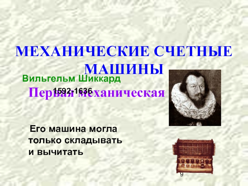 Слайд 9 МЕХАНИЧЕСКИЕ СЧЕТНЫЕ МАШИНЫ Первая механическая машина