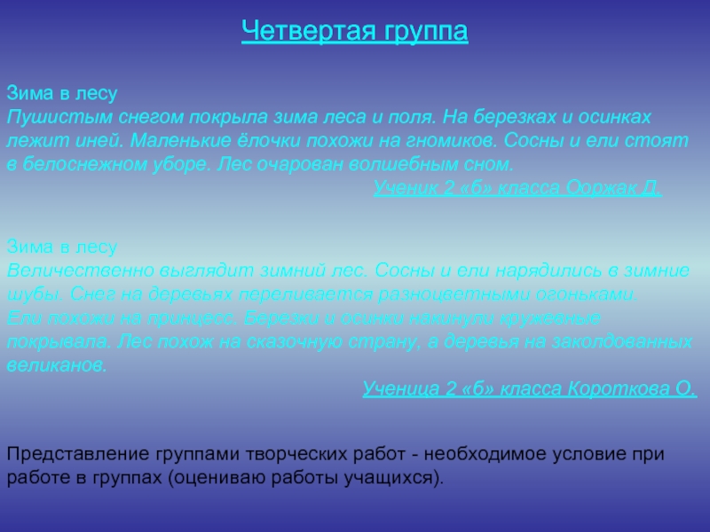 Представление группами творческих работ - необходимое условие при работе в группах (оцениваю работы учащихся).