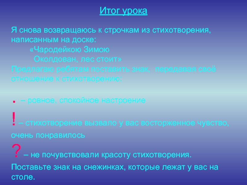 В лес пришла пушистая зима. Сосны и ели она нарядила в белоснежные шубы. На верхушки деревьев до самых бровей надела теплые шапки. На рябинку накинула зима искристое покрывало. Веточки берёз украшены кружевным инеем. Раздвинуло солнышко тучку. Под его лучами сверкает снег. Блистательная картина кругом!