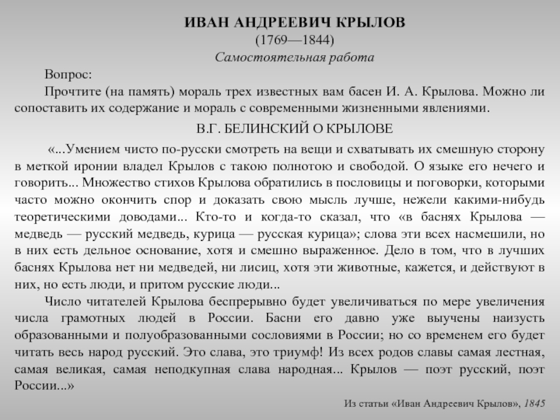В.Г. БЕЛИНСКИЙ О КРЫЛОВЕ